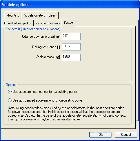 The Power tab allows you to enter the aerodynamic drag for the vehicle, the rolling resistance for the wheels and the mass of the vehicle. To calculate the aerodynamic drag (CdA) and rolling distance, click here.