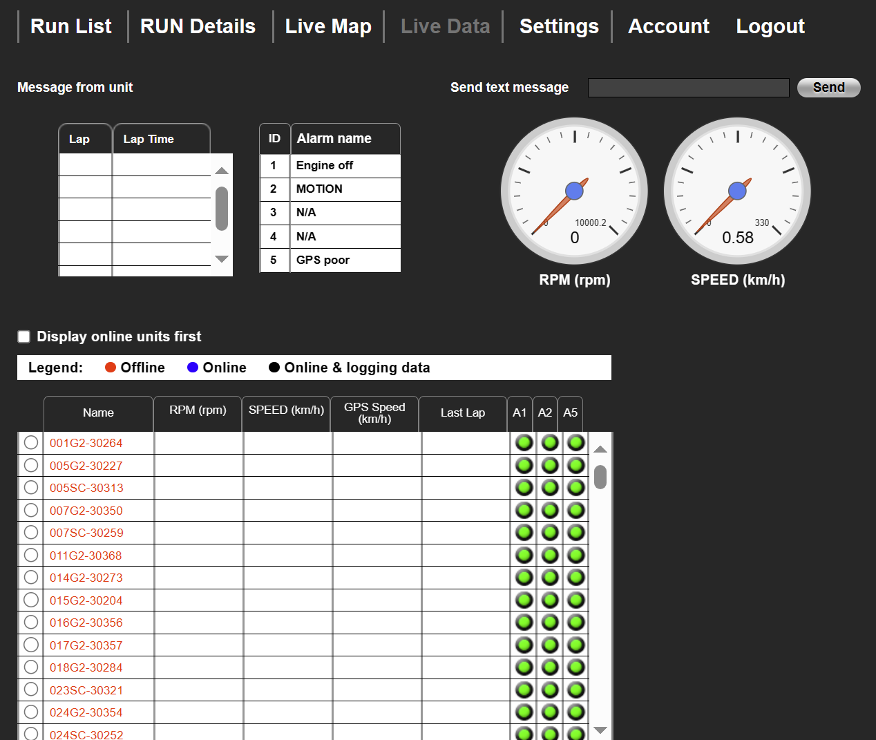 This section shows the information relating to the live data coming from the cloud connected units. The displayed data includes lap timing data and alarms. It also shows the messages from the units and allows you to send text messages to the cloud connected units.