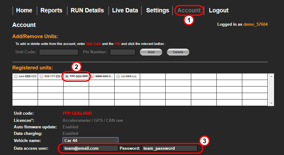 To allow a team access to their data they need a login and password to access the read only section of the RT Cloud. To generate this log in to the main scrutineeering account and select "Account"