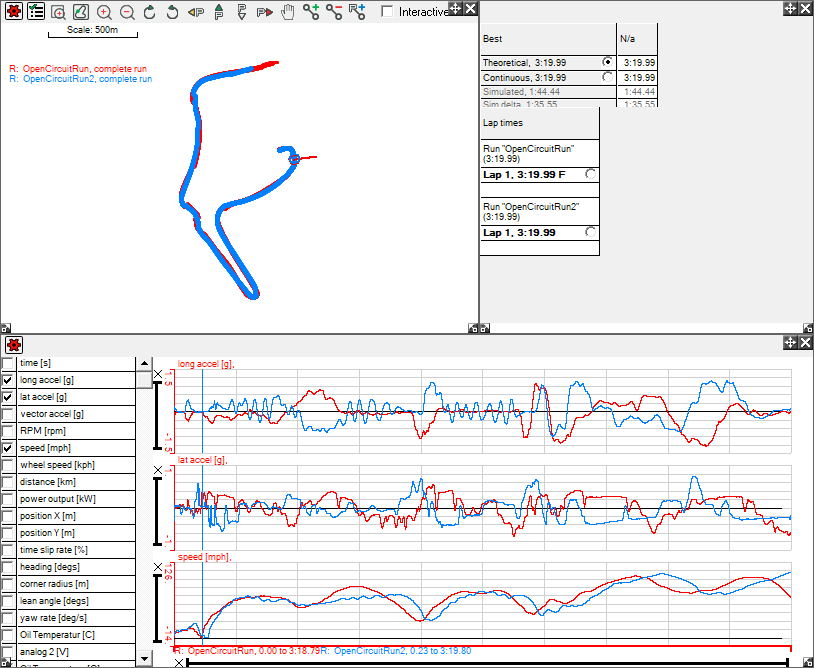 When doing analysis on “open circuits” typical of hill climbs and sprints, rather then closed laps, there are some considerations and techniques. The key difference when considering open laps is that with a closed circuit you need to add a “lap marker”, which is a special track marker and it’s shown in red: