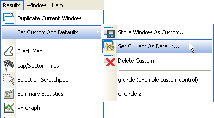 In Version 6 of the software, the different analysis tools will have default settings, i.e. every time you click the track map button, it will open with the same settings. It is possible to save your personal preferences for the different windows for later or default use. This means that you can make your windows open to your preferences, this will also save the position and size of the window. By saving the window to a custom, you can "stick" the options you have chosen to a personalised name, and place the window on the Set Custom And Defaults menu.
