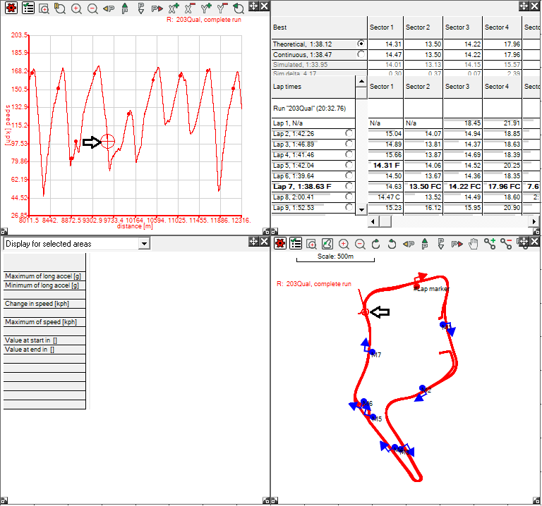When you select a point on the track map, the results will be exactly the same as when you click on the XY graph. Please note that the marker on the graph may not always appear. If you cannot see the marker, please check that the Track Map and the XY Graph are displaying the same data, e.g. the same lap. If you have lap one on the XY Graph, and you select a point on the Track Map that is on lap two, then no marker will be displayed on the XY Graph.