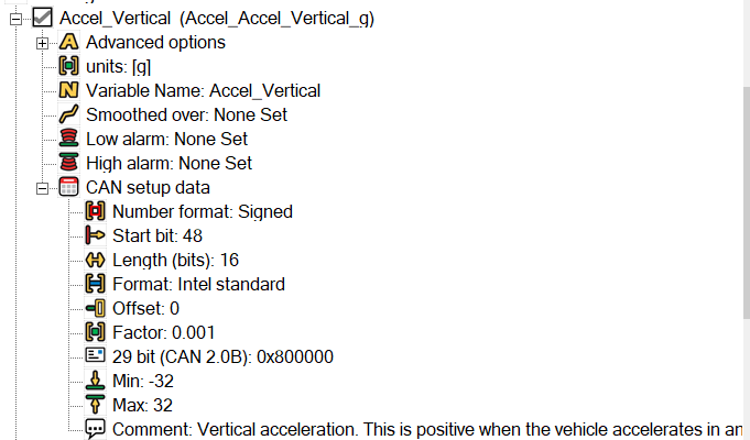 Expanding a sub message will list configuration. The maximum rate of change, variable name, smoothing, Low alarm, High alarm values can all be edited here. The CAN specific configuration cannot be edited and is read from the .DBC file.