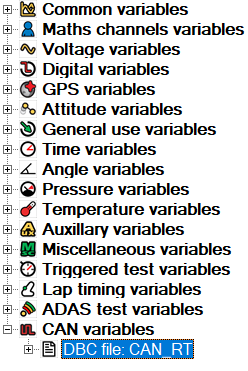 - After a DBC file is added it will appear under CAN variables in the variable tree, in the right side of the DASH4PRO FD configuration software.