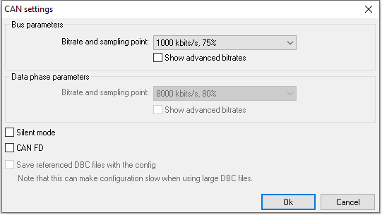 For standard CAN 2.0B select the required bit rate and sample point. If using CAN FD then this box must be ticked and the correct data phase parameters selected.