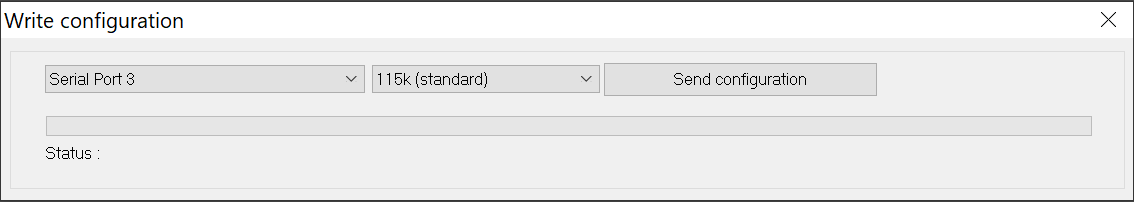 Select the connected port and press Send configuration button to send the current configuration file.