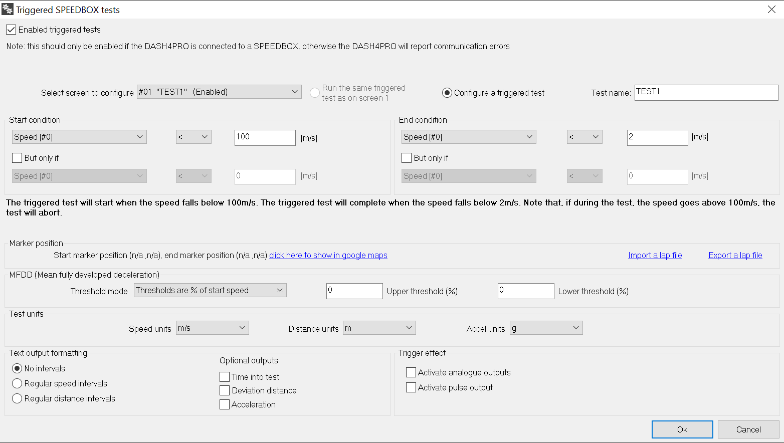 This screen is used to configure the triggered SPEEDBOX tests. To display the test results on DASH4PRO FD, SB Text Results object needs to add to the screen(s) that you configure.