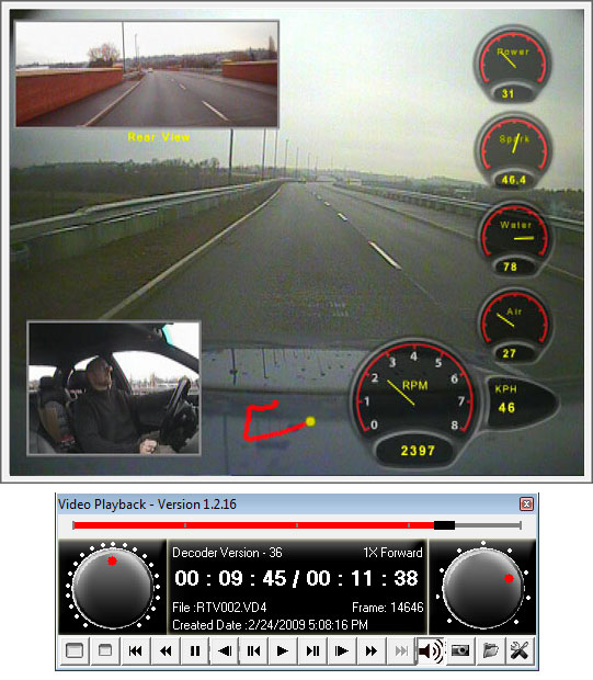 Users are able to create their own overlay design using the video sources and overlay objects in any combination using the RT VIDEO4 Configuration Tool. These objects can be assigned to RT Variable IDs which can control those objects dynamically (For example assigning SPEED variable to speedometer). The user can configure many settings using this tool including video format (NTSC or PAL), Video Bit rate, Recording Format (I, IP, IPB), Audio Volume, Chapter mark conditions and Brightness, Contrast, Saturation, Hue for each video input.